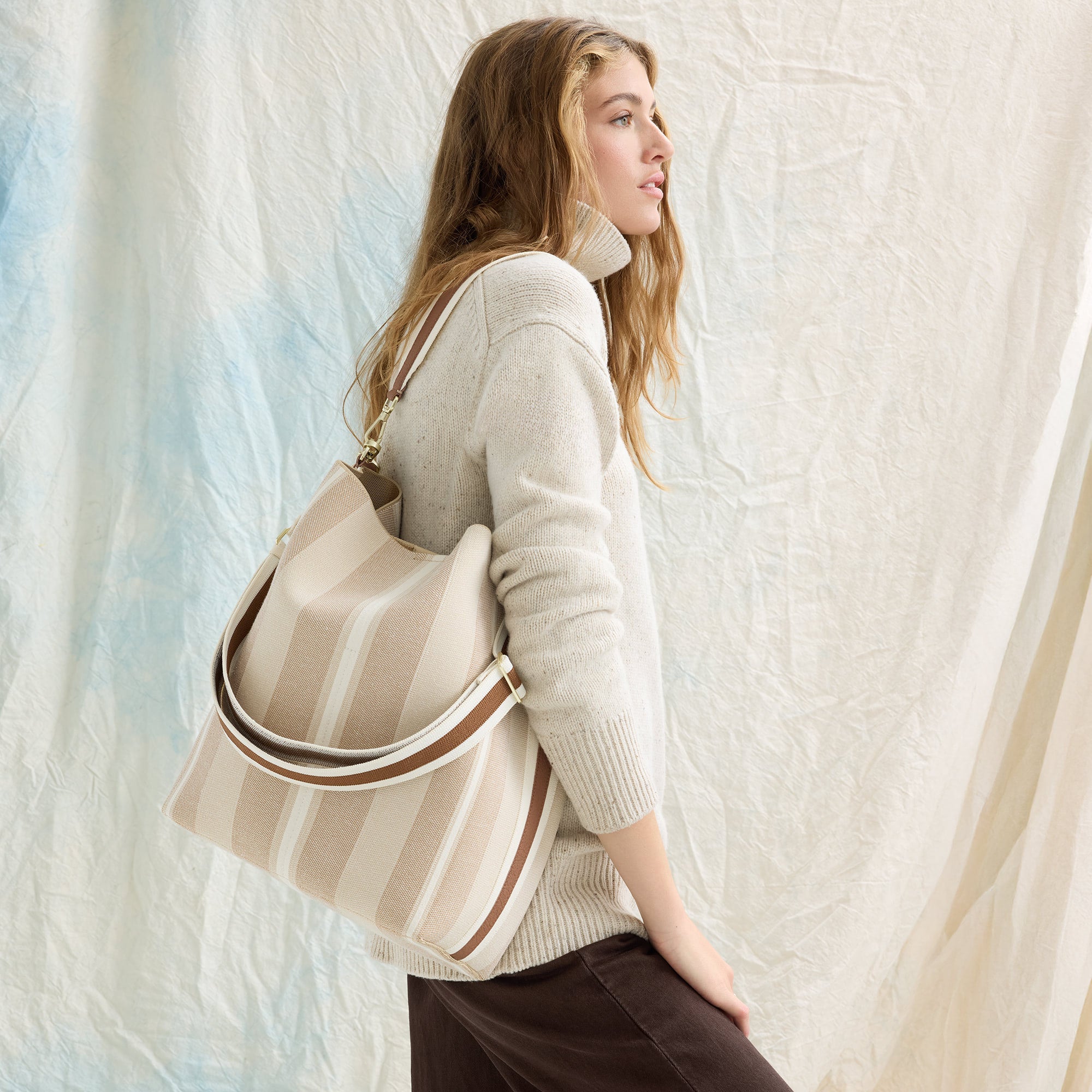 - Adjustable crossbody strap in ivory and brown stripe knit.