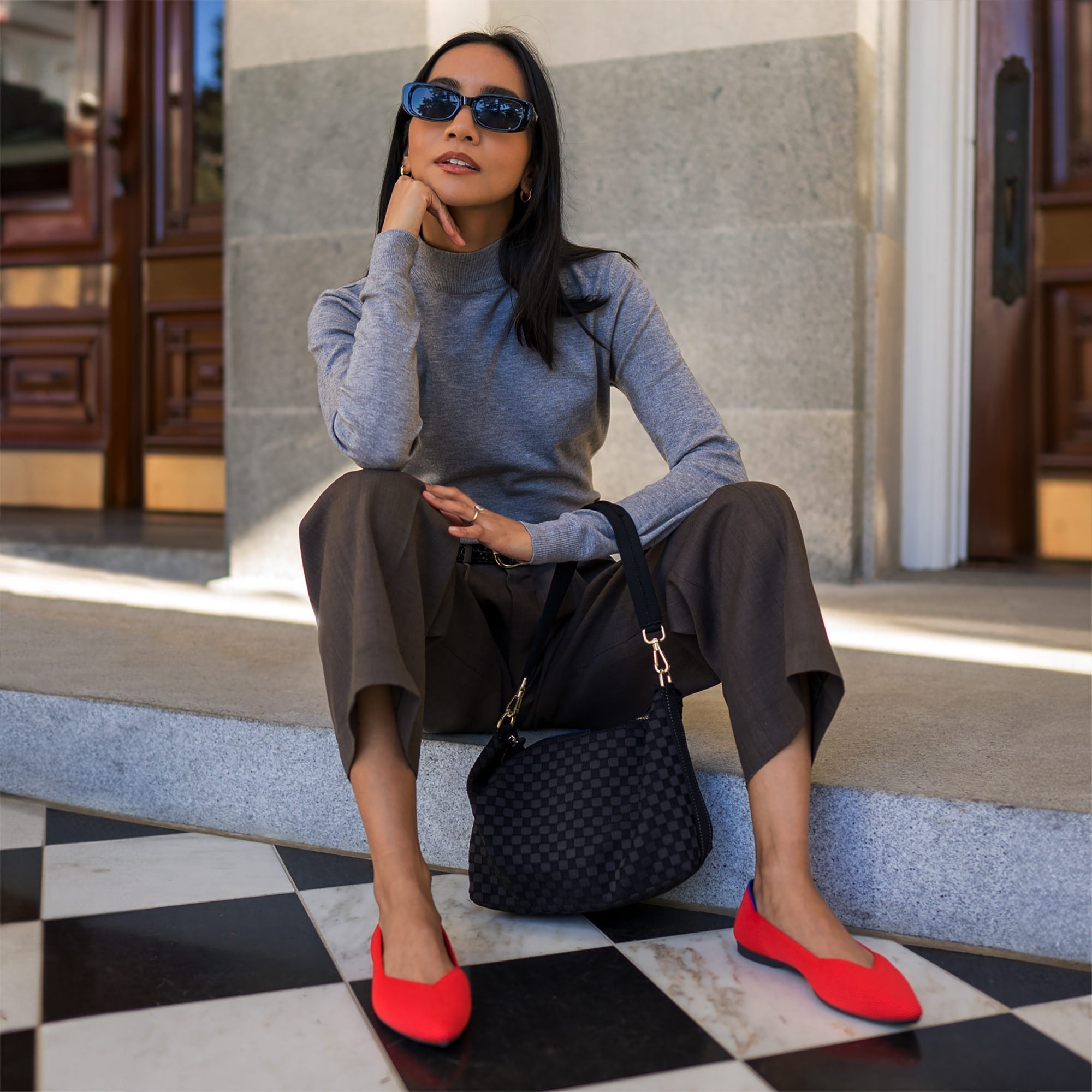 - Detachable, adjustable crossbody strap with an elevated saddle stitch detail in black.