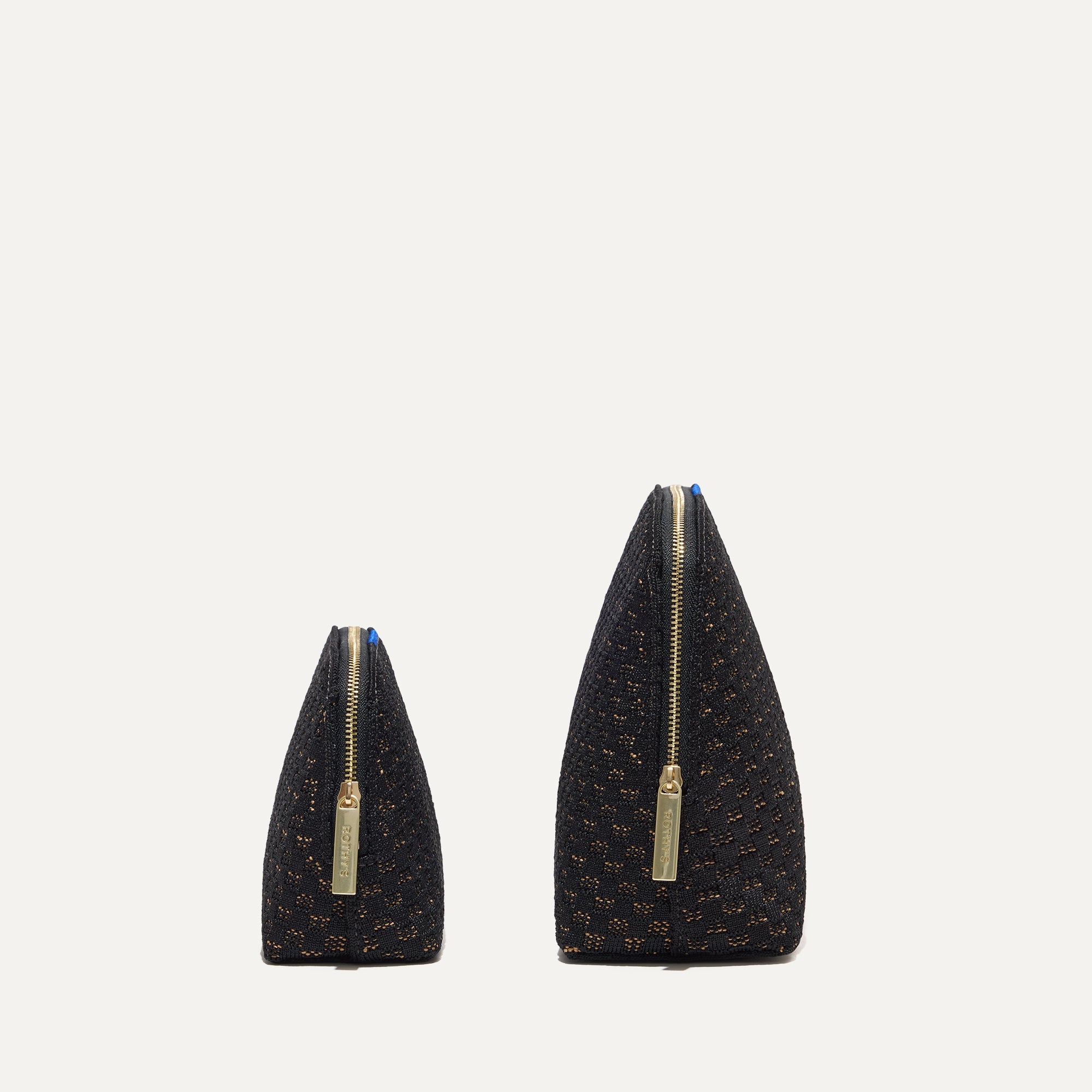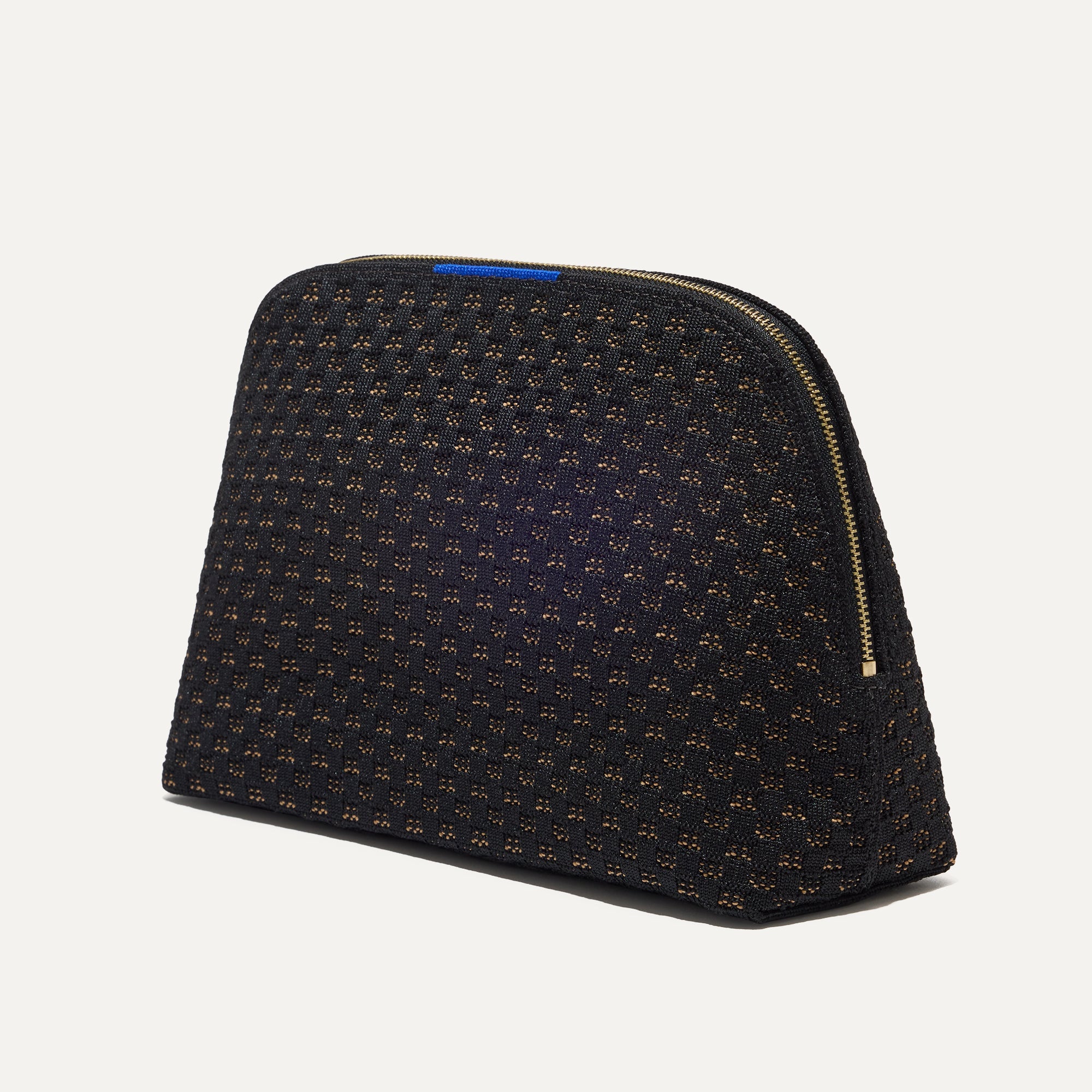 - Lightweight, structured style that keeps its shape. Small and large pouches come in a black and camel basketweave pattern.