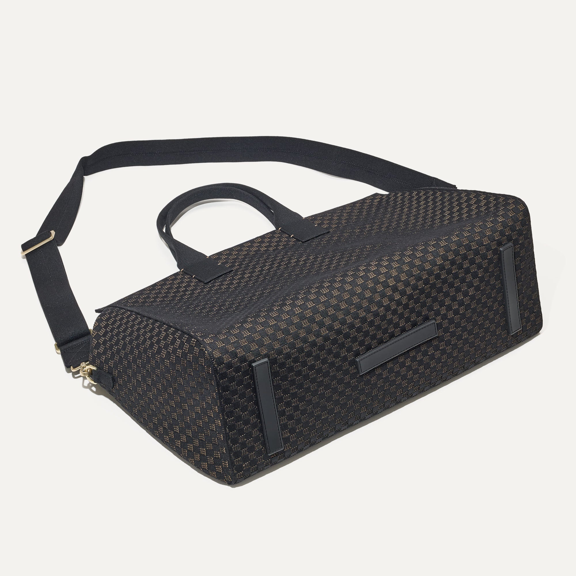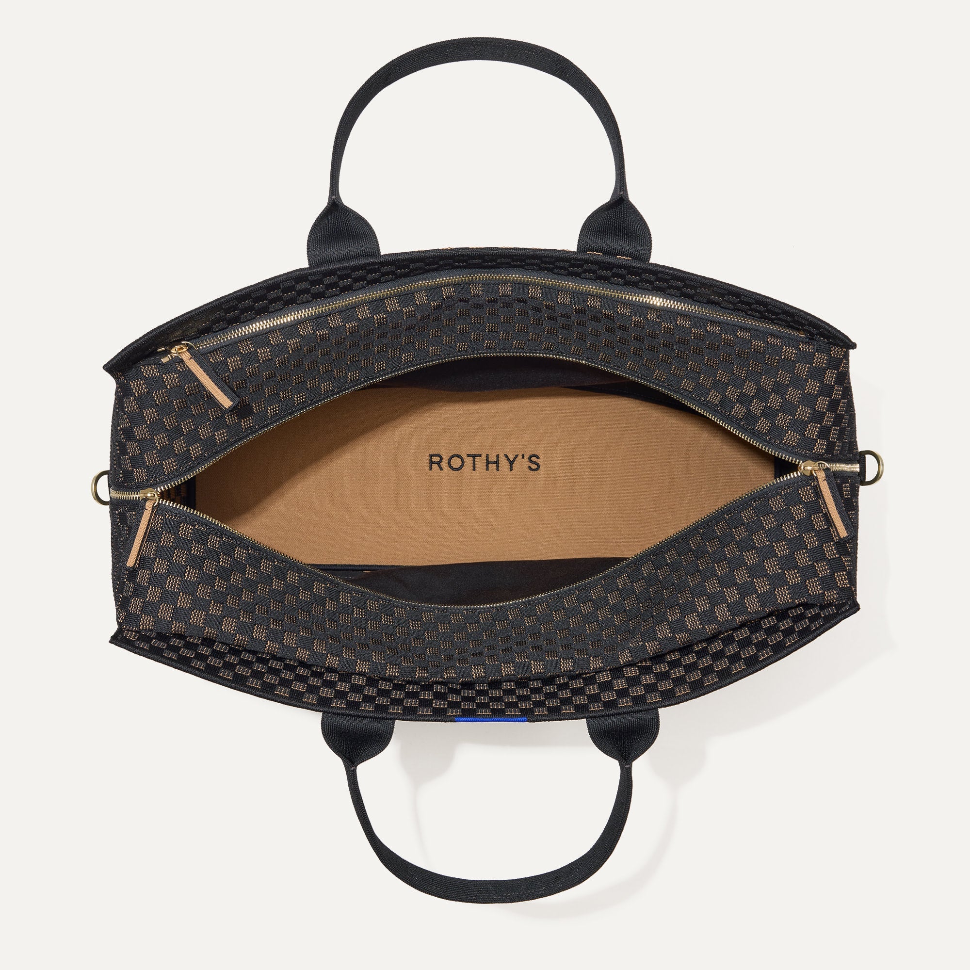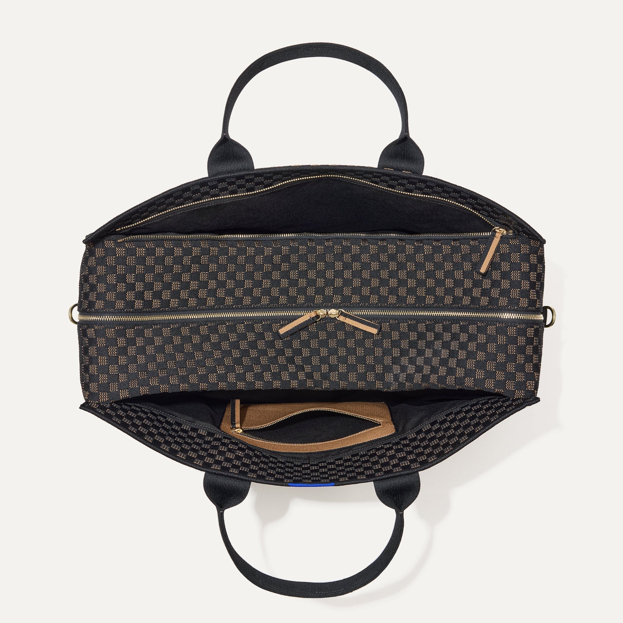 - Structured design in a black and camel basketweave pattern, with a double-zipper top closure and durable bag feet.