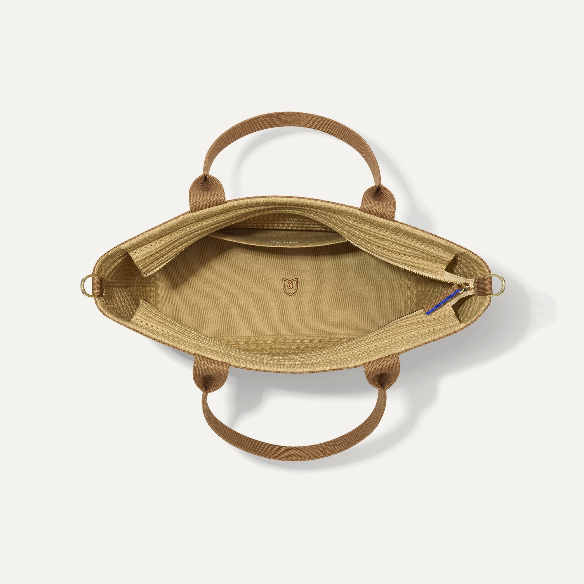 - Durable top handles in warm brown fit comfortably over the shoulder.