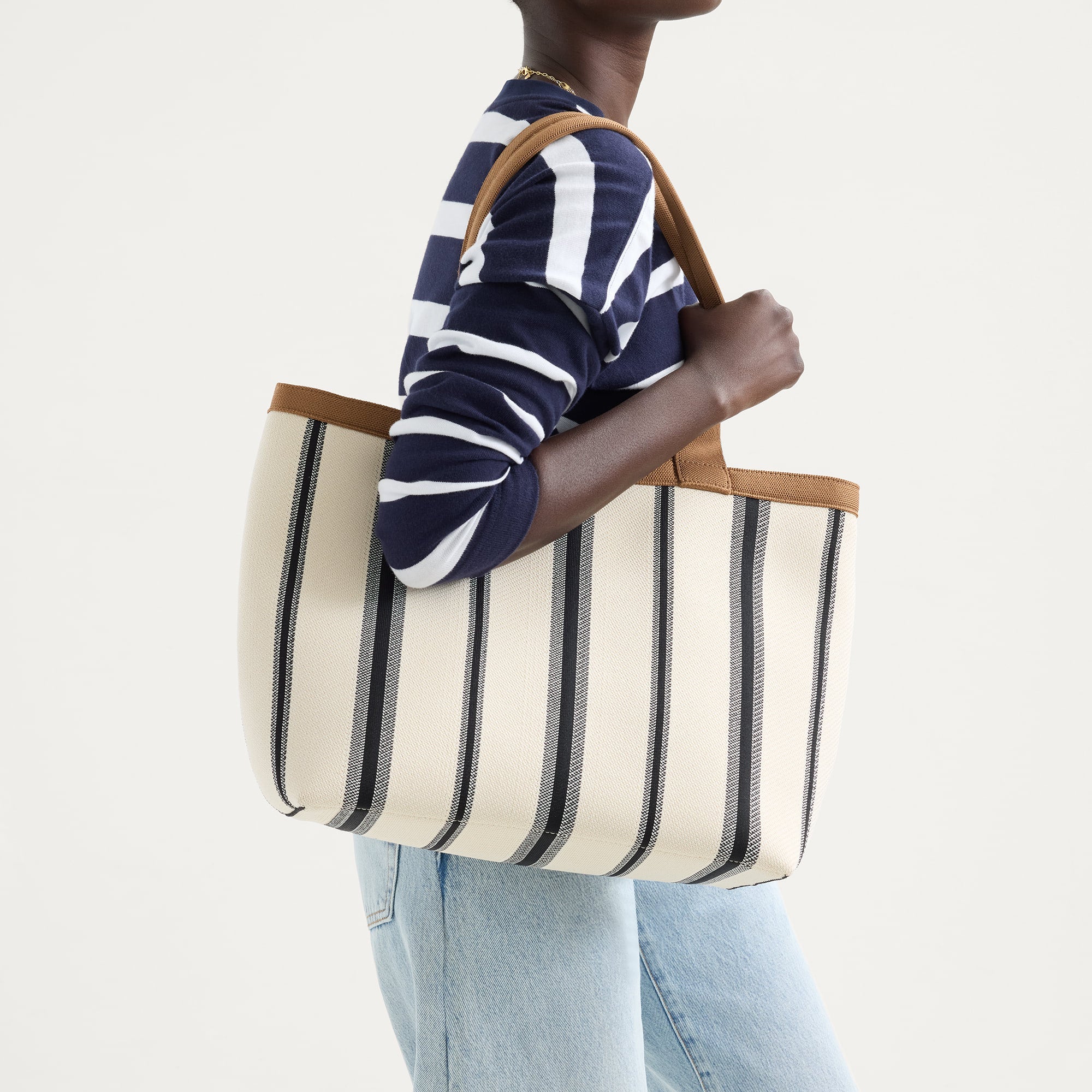 - Durable top handles in tan fit comfortably over the shoulder.
