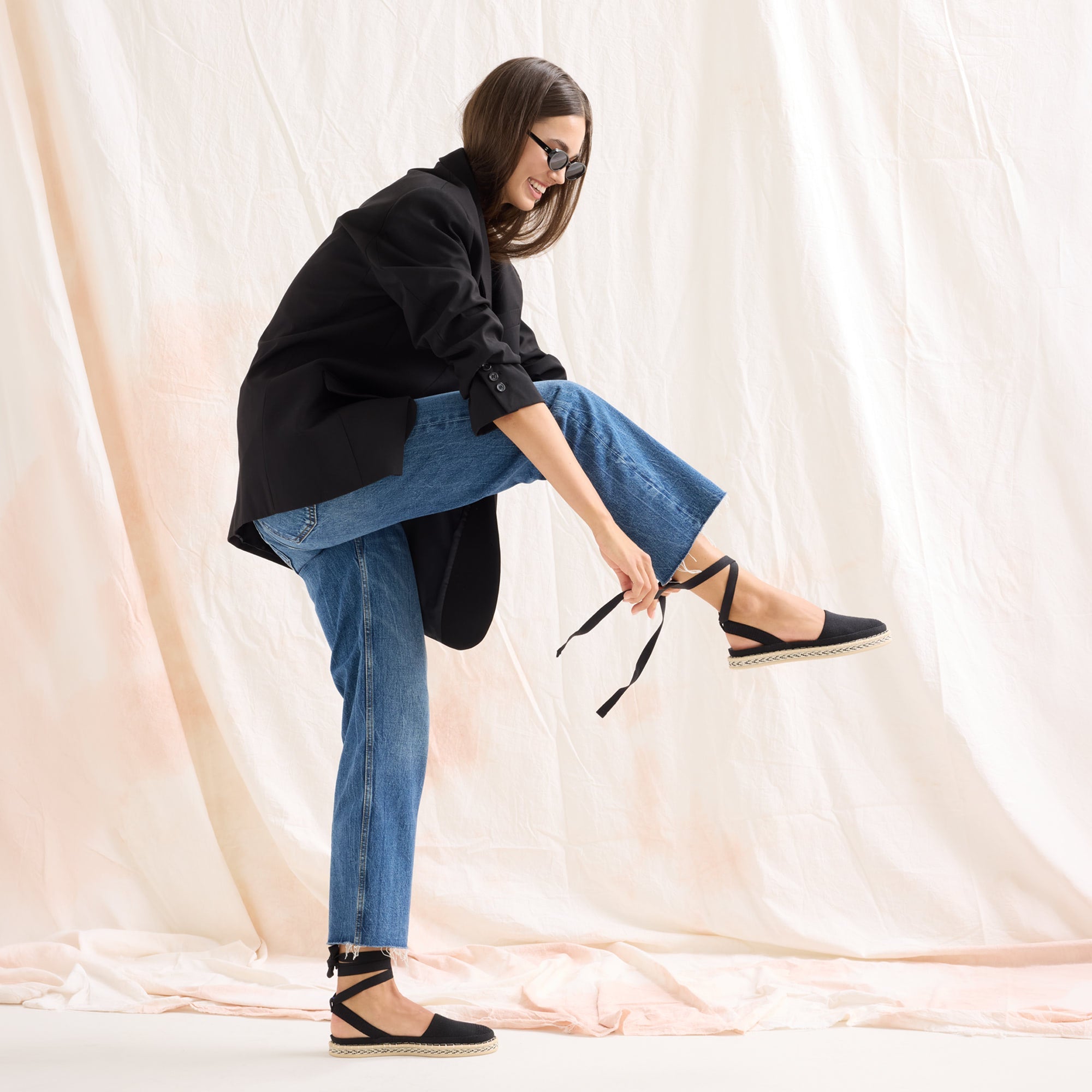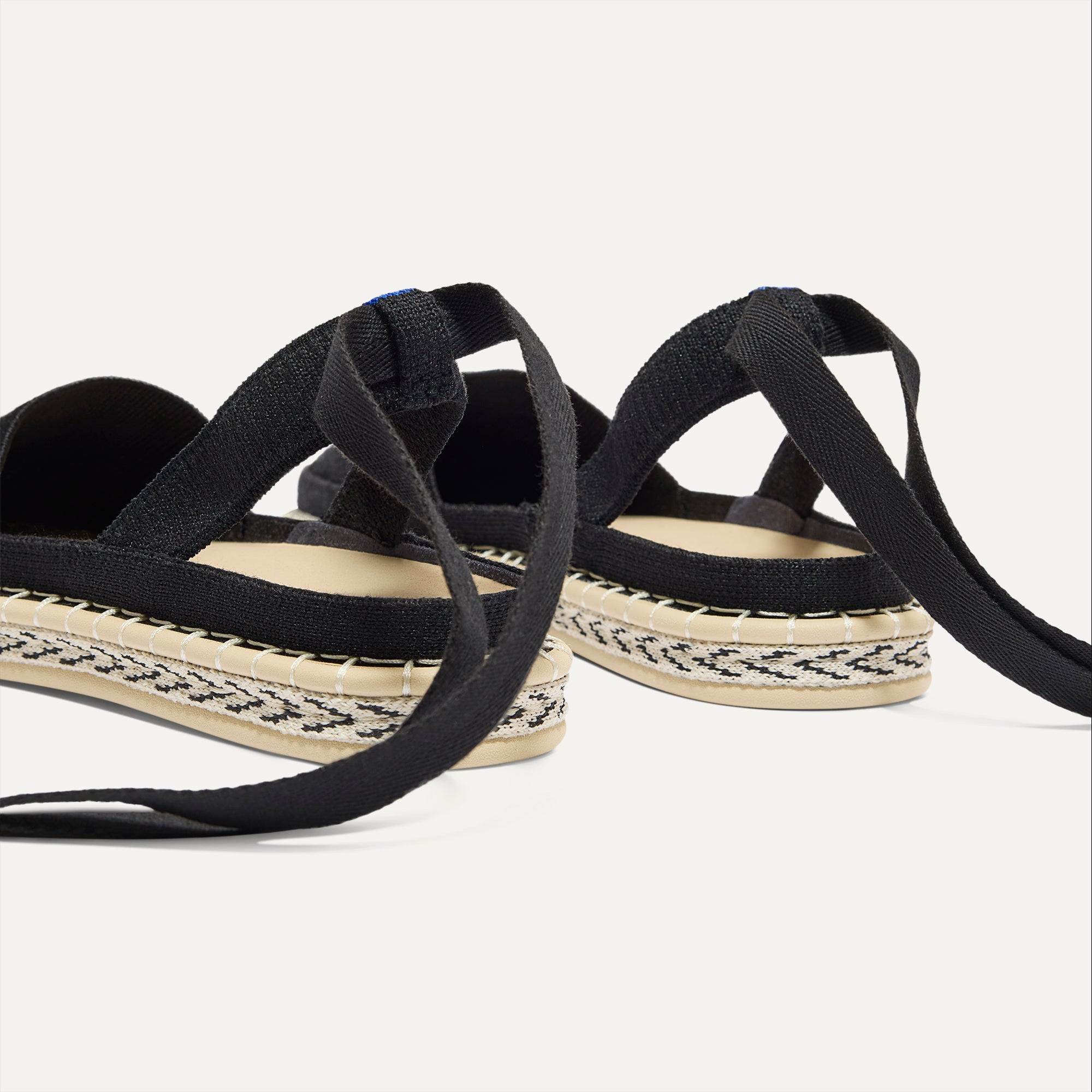 • Classic espadrille look with removable black tie-up ankle straps.