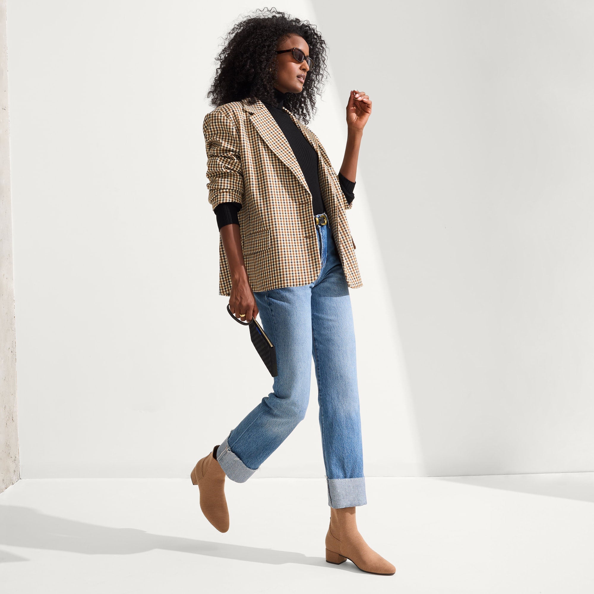• Sleek block 1.5-in (4-cm) heel for added height.