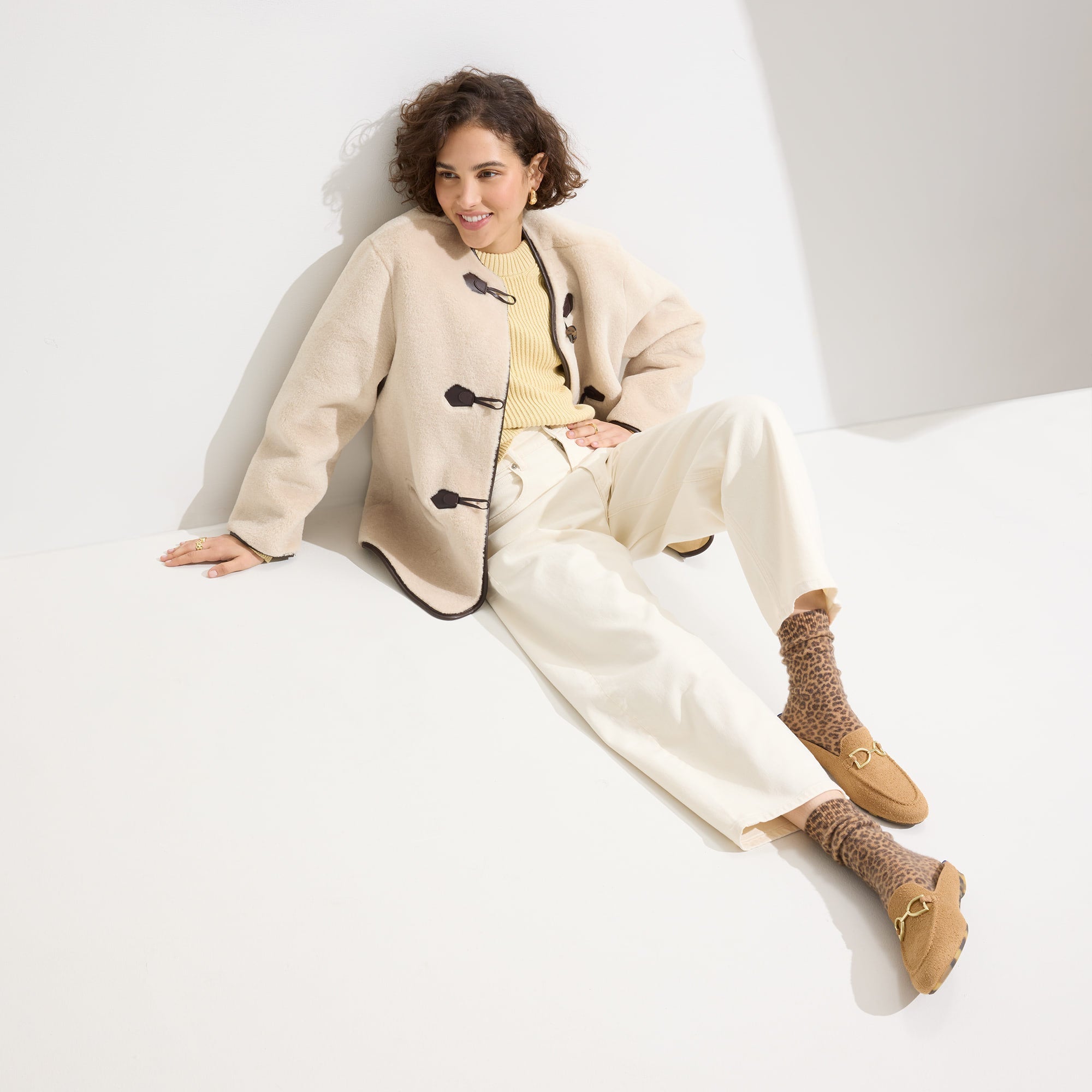• Soft, flexible bouclé upper in camel brown.