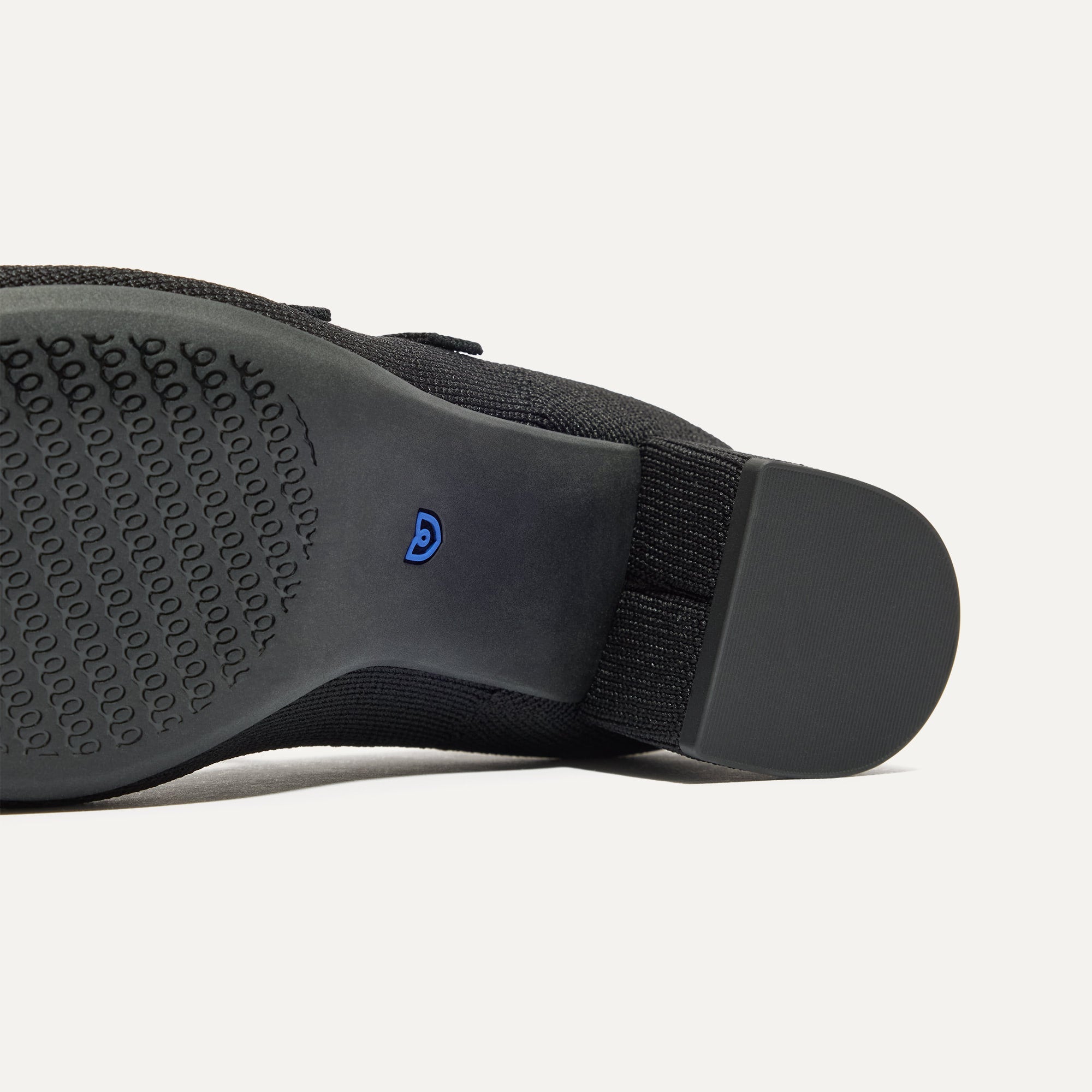 - Soft, flexible upper in black knit with Rothy’s signature thread.
