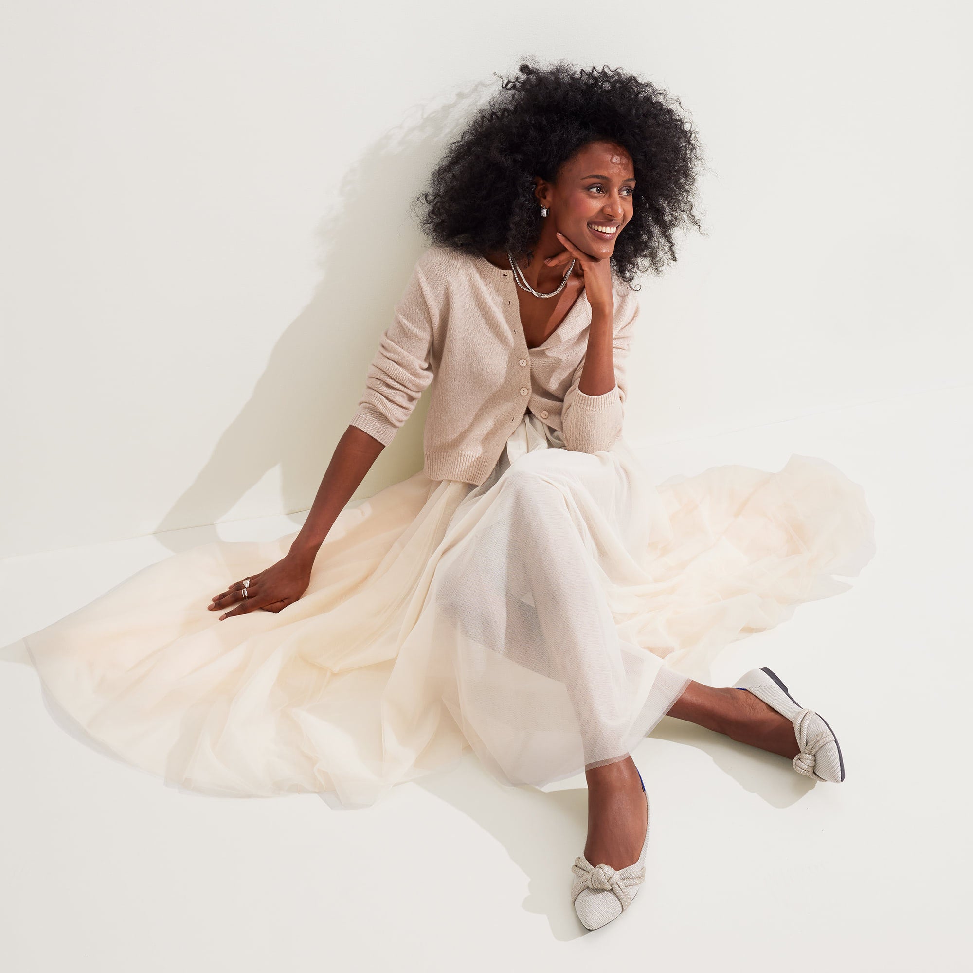 • Premium knit upper in soft platinum shimmer with a knot on the vamp.