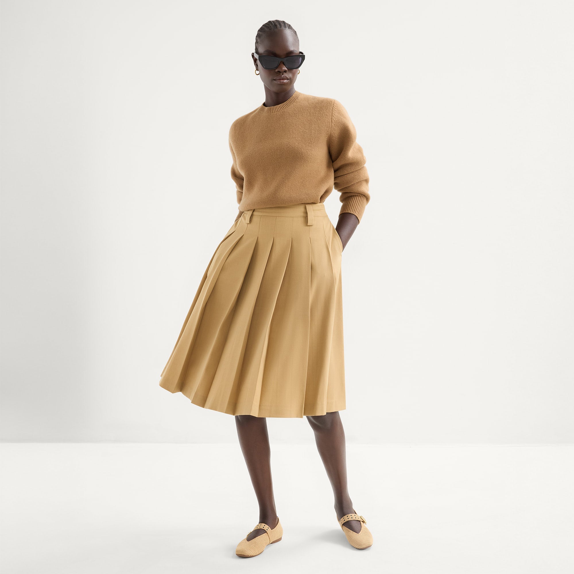 - Knit, woven upper in tan with a square toe box and a sharp V-shaped vamp.