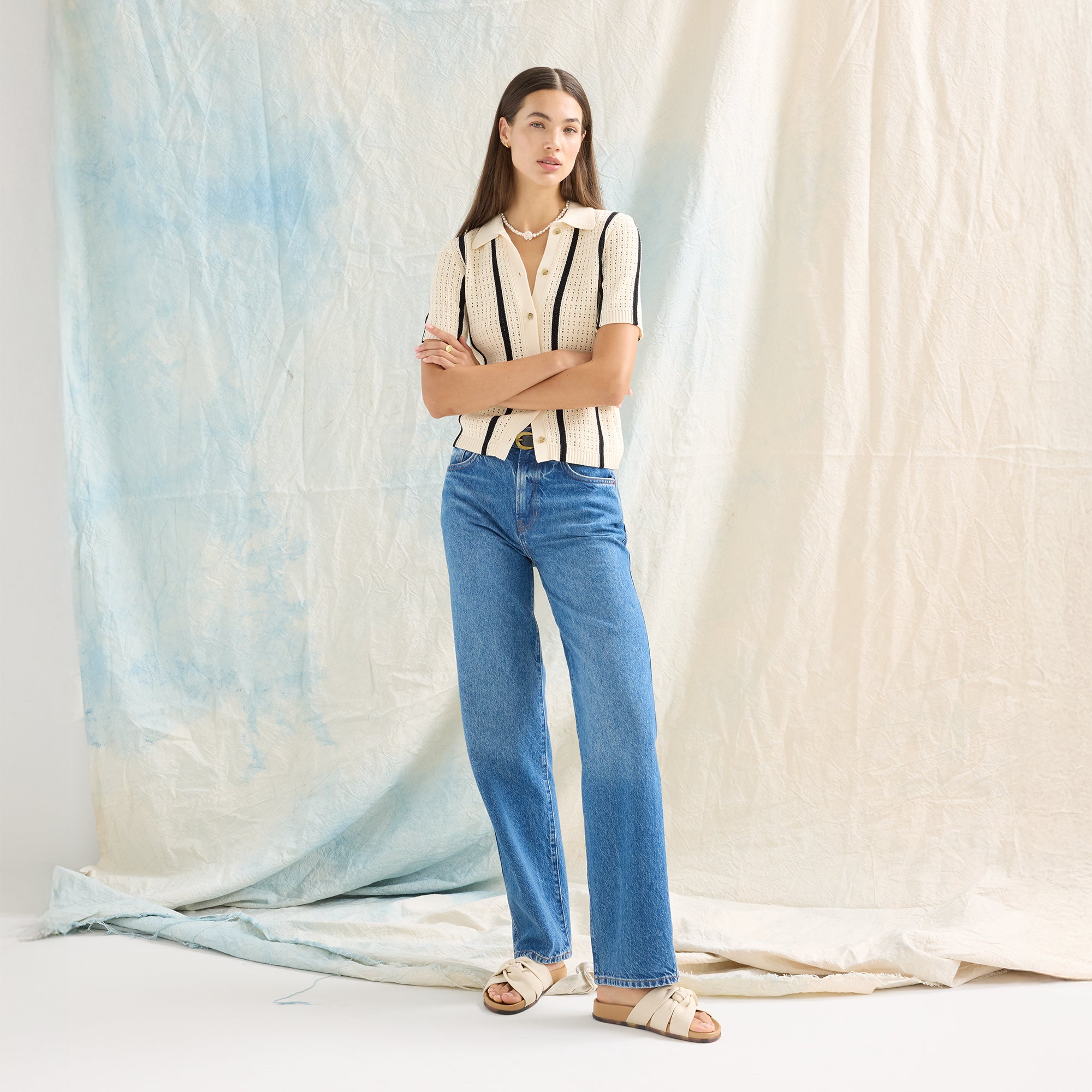 • Softly knit upper in ivory features three wide straps twisted into a knot.