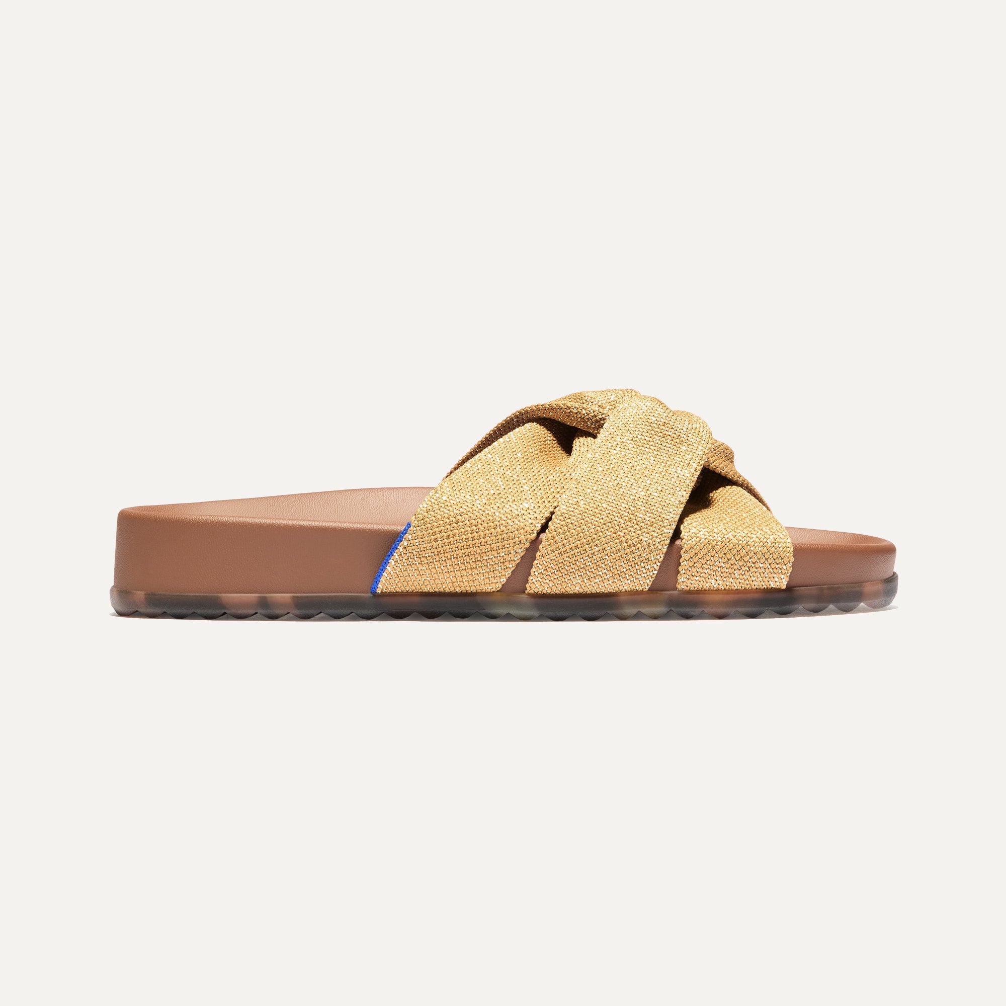 • Softly knit upper in a shimmery metallic gold features three wide straps that twist into a knot.