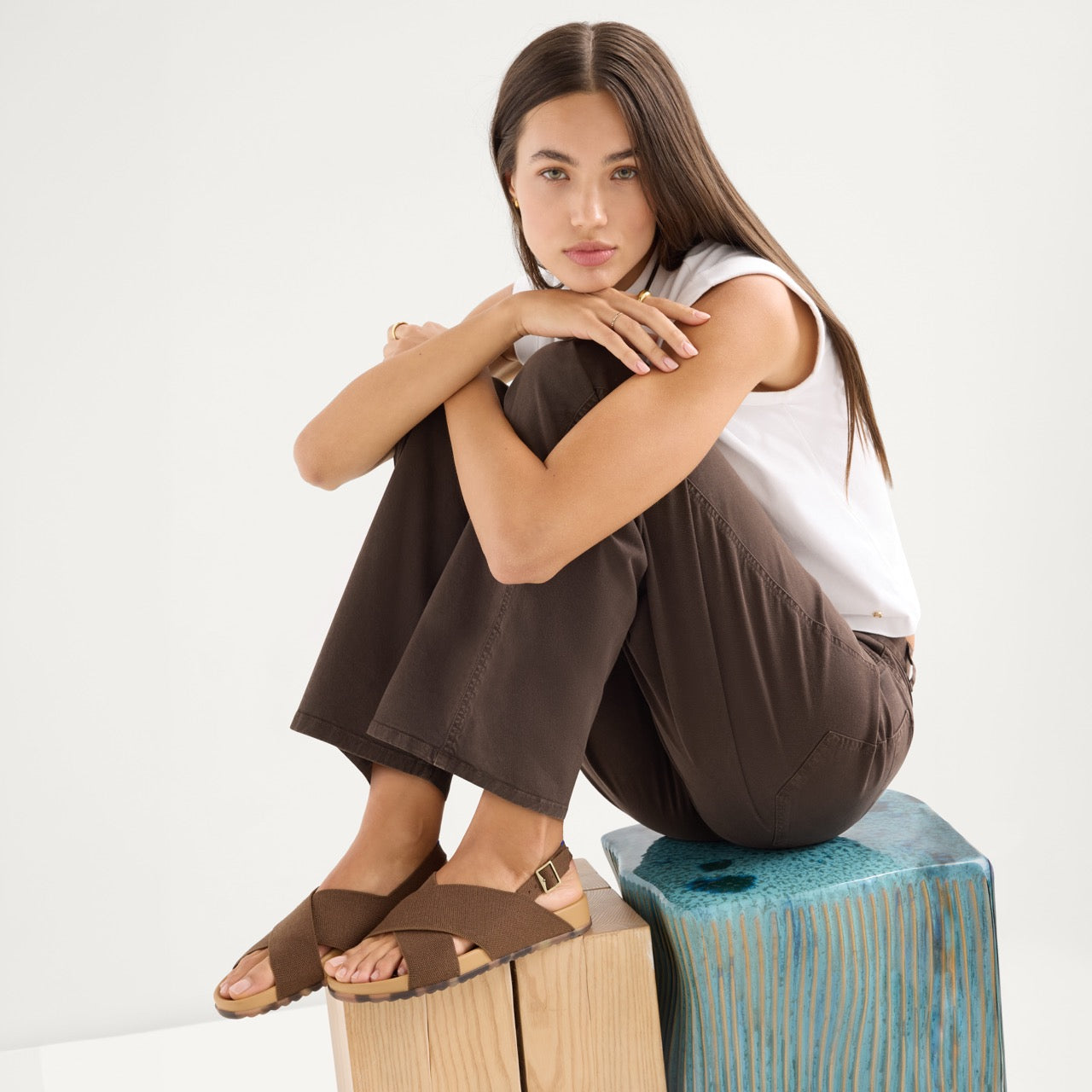 • Two wide brown crossing straps. Very flexible, very comfy.